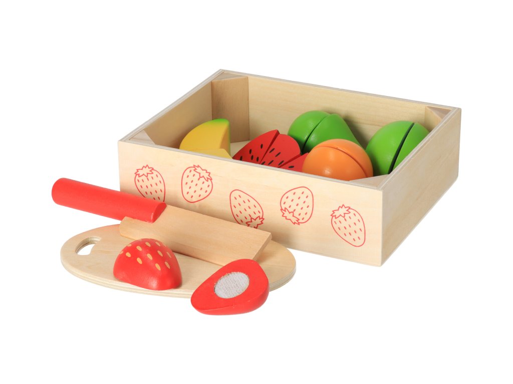 Drvena kutija puna raznobojnog voća, koje djeca mogu rezati i zatim ponovno spajati čičak trakom. Paket uključuje drveni nož i dasku za rezanje.