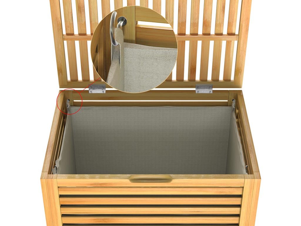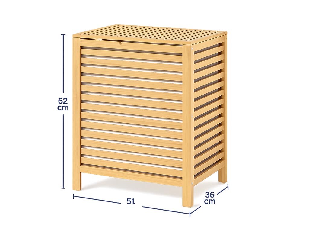 Košara za rublje od bambusa, kapaciteta 62 litre, pruža dovoljno prostora za veće količine rublja. Robusna konstrukcija, izrađena od visokokvalitetnog prirodnog bambusa, jamči visoku stabilnost i dug vijek trajanja. Bambusovi dodaci također su lakirani, što ih čini prikladnima za prostorije s većom vlagom.