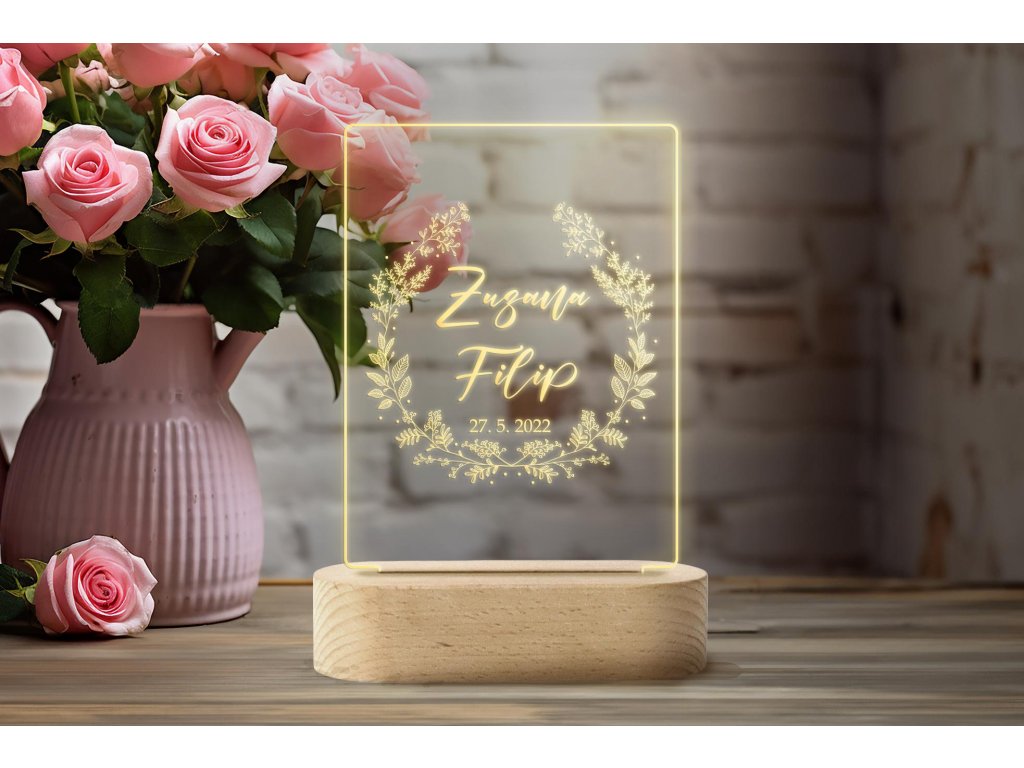 Originalni svadbeni dar i prekrasan podsjetnik na vašu međusobnu ljubav - to je LED svjetiljka s imenima. Kombinacija akrilnog stakla i drvenog stalka osvijetlit će svaki interijer.