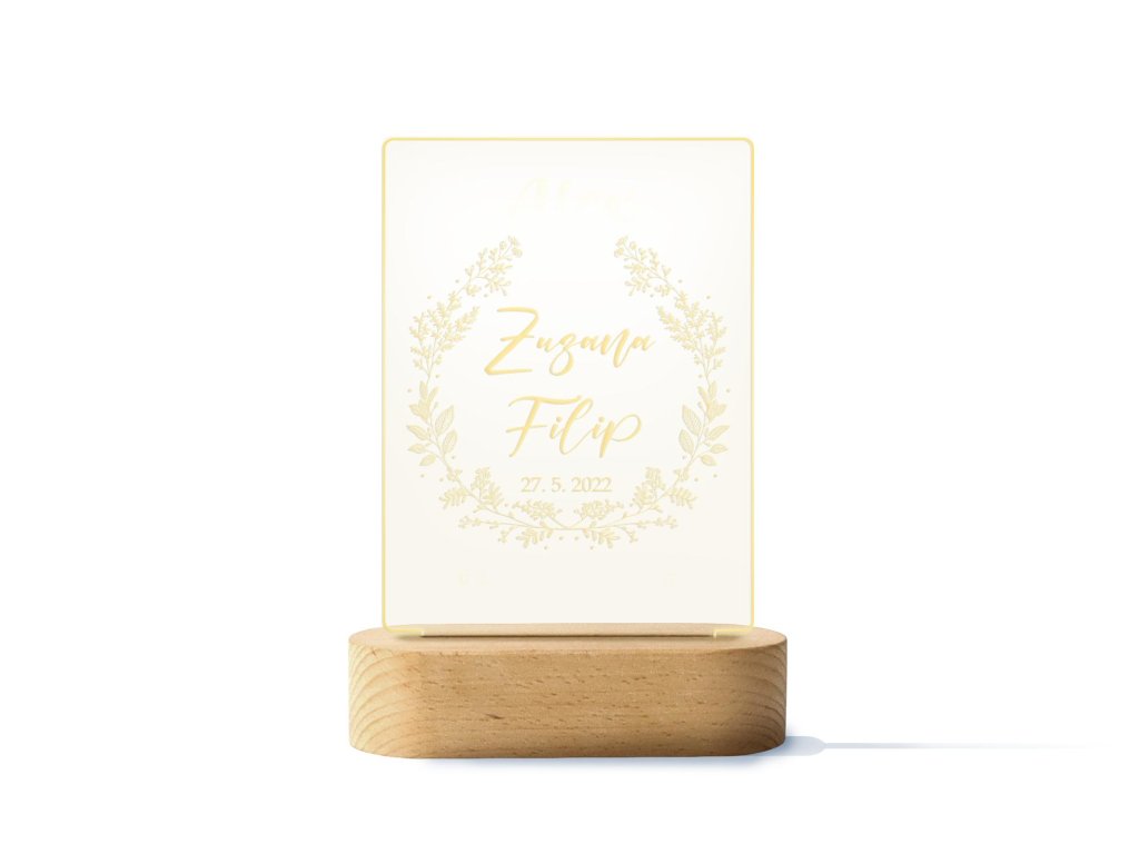 Ugravirana LED svjetiljka s imenima izvrstan je način za proslavu obljetnice ili životnog događaja. Kombinacija akrilnog stakla i stalka od bukve s ugrađenim svjetlima osvijetlit će interijer i privući pažnju na prvi pogled.