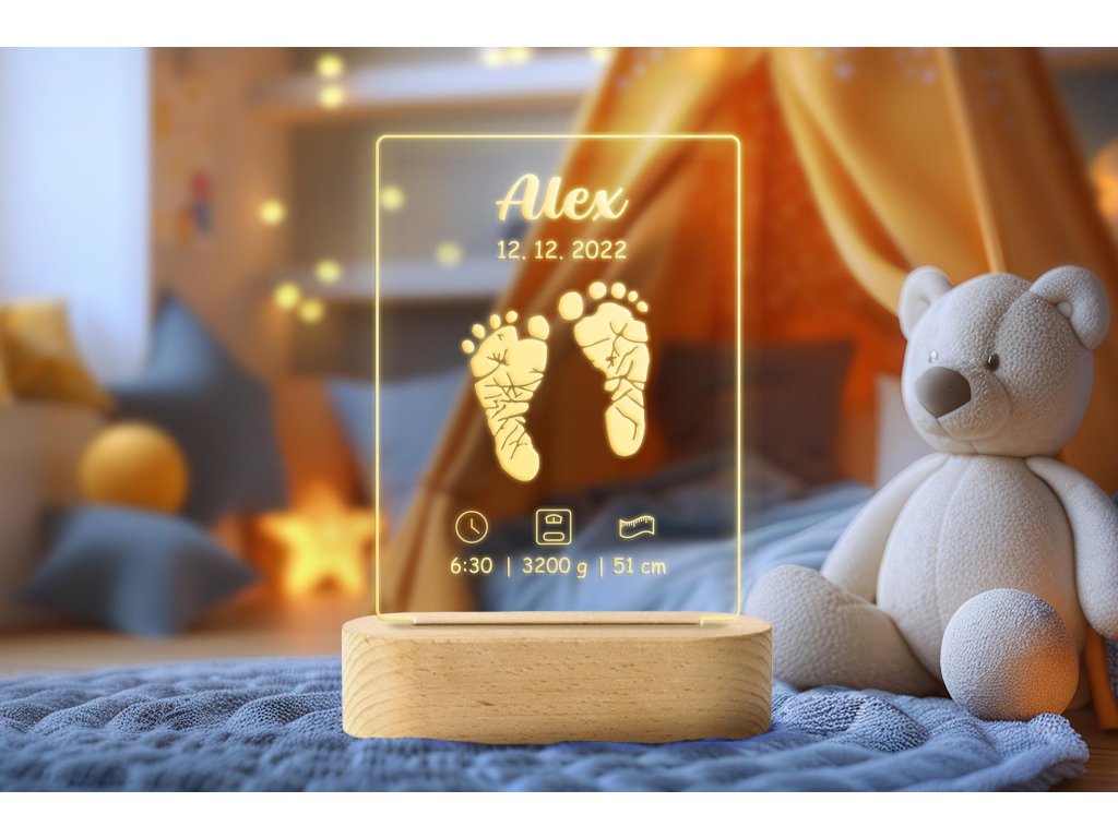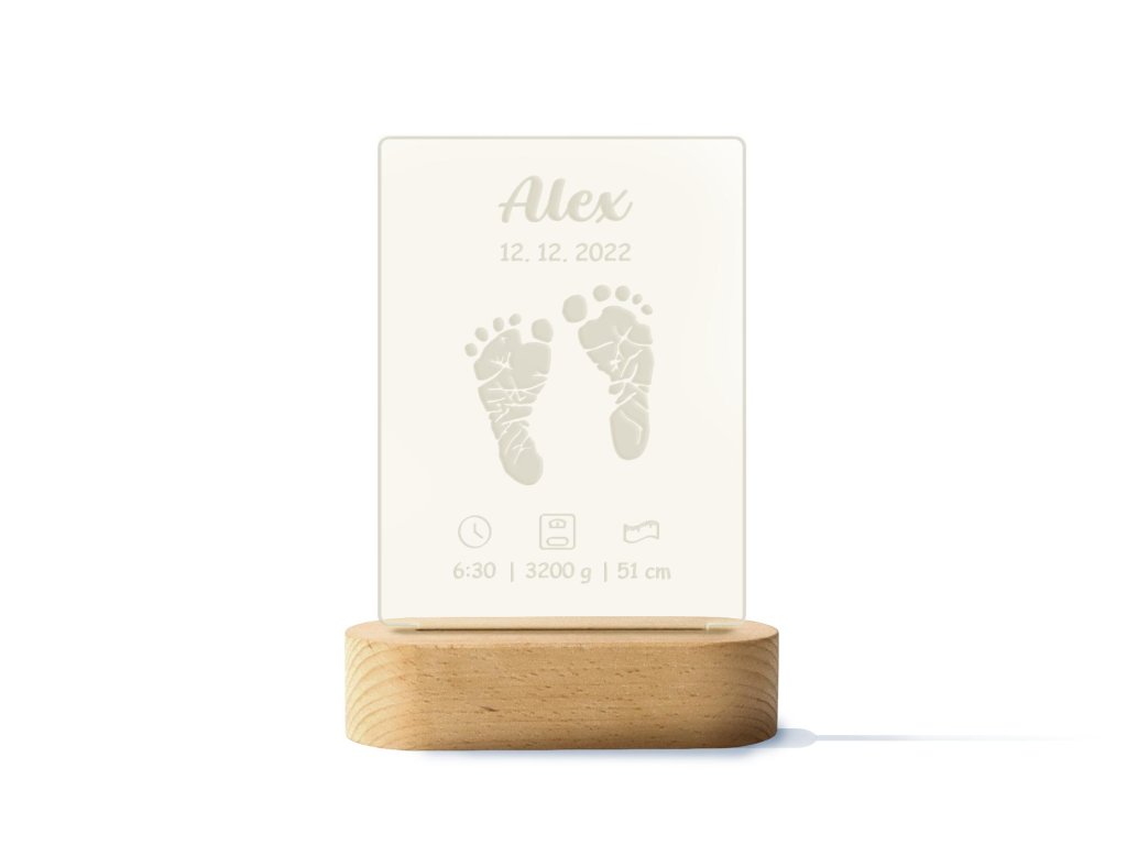 Svaka beba je jedinstvena i originalna, ali jedna stvar je za sve zajednička – rastu vrlo brzo. Sačuvajte lijepu uspomenu na rođenje vašeg djeteta u obliku jedinstvenog personaliziranog ukrasa. Kombinacija akrilnog stakla i stalka od bukve s ugrađenim LED svjetlima osvijetlit će vaš interijer i privući pažnju na prvi pogled.