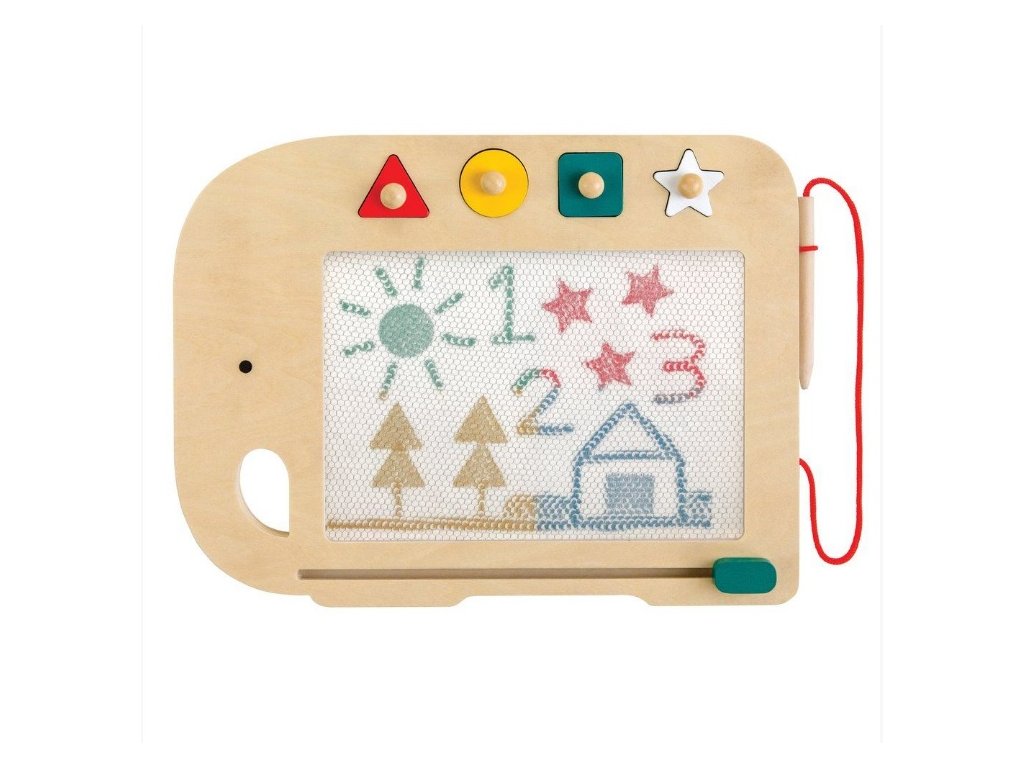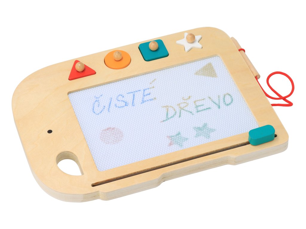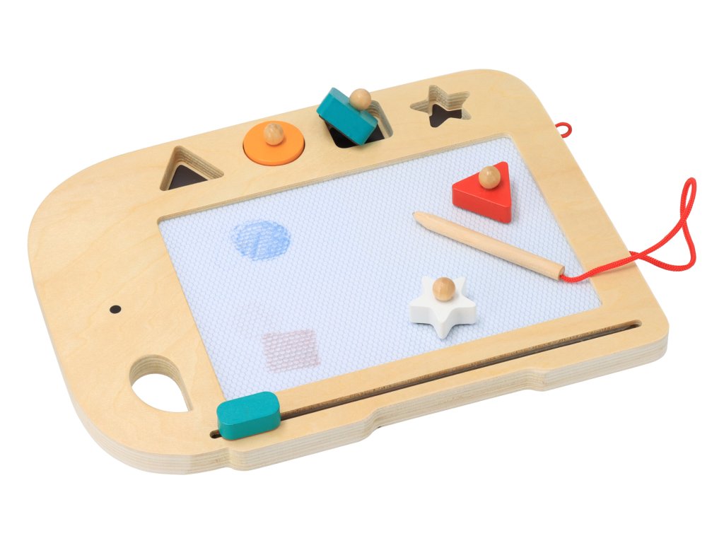 Tablica također uključuje 4 drvena pečata (trokut, krug, kvadrat, zvijezda) koji su magnetizirani kako bi ostali na mjestu.