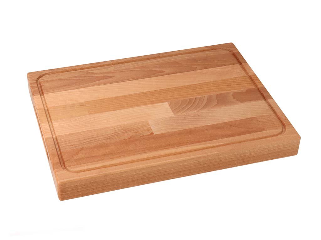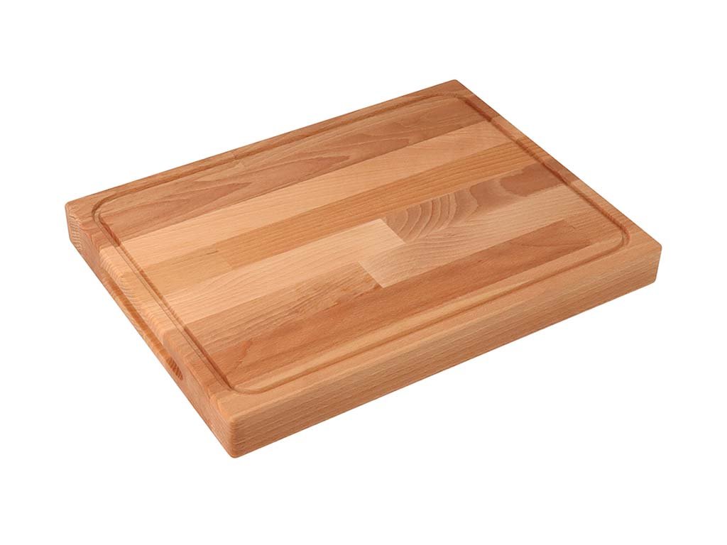 Masivna daska za rezanje dimenzija 40 x 30 x 4 cm, pogodna za rezanje i posluživanje kruha, povrća, ali i mesa. Izrađena od kvalitetne parene bukve.