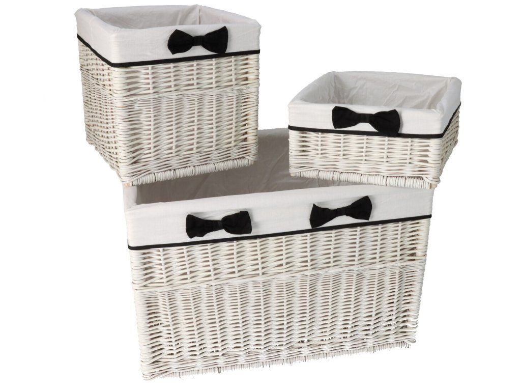 Dizajnerski trodijelni set košara od oguljenog pruća obložen bijelom tkaninom s ukrasnim mašnama koji će sakriti puno stvari iz vaših ukućana. Na ovom prekrasnom pletenom kompletu pozavidjet će svaki posjetitelj.