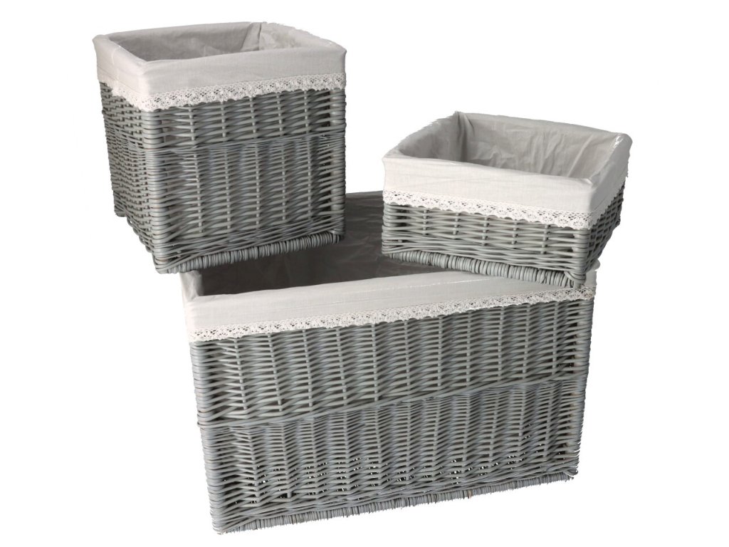 Dizajnerski trodijelni set košara od oguljenog pruća u sivoj boji podstavljen bijelom tkaninom s ukrasnom čipkom, koji će sakriti puno stvari iz vaših ukućana.