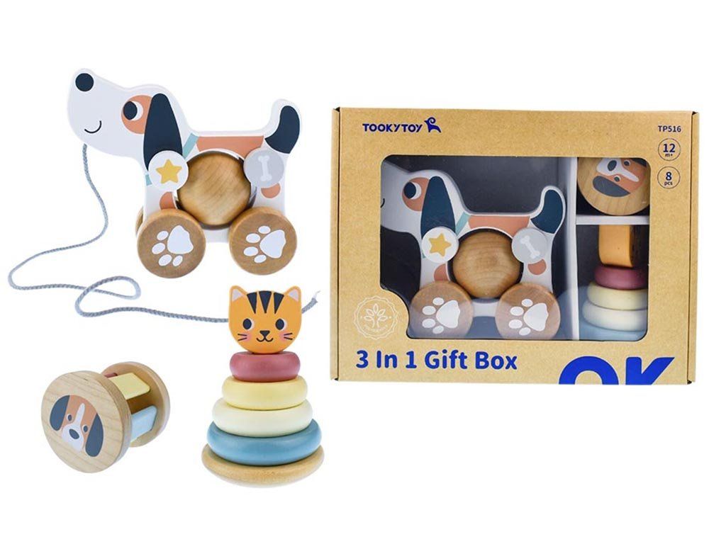 Poklon set za mališane spaja zabavu i razvoj - sigurne drvene igračke podržavaju djetetove motoričke vještine, koordinaciju i senzorne sposobnosti. Idealno kao prva igračka ili poklon za djecu od 12 mjeseci, što će razveseliti i roditelje.