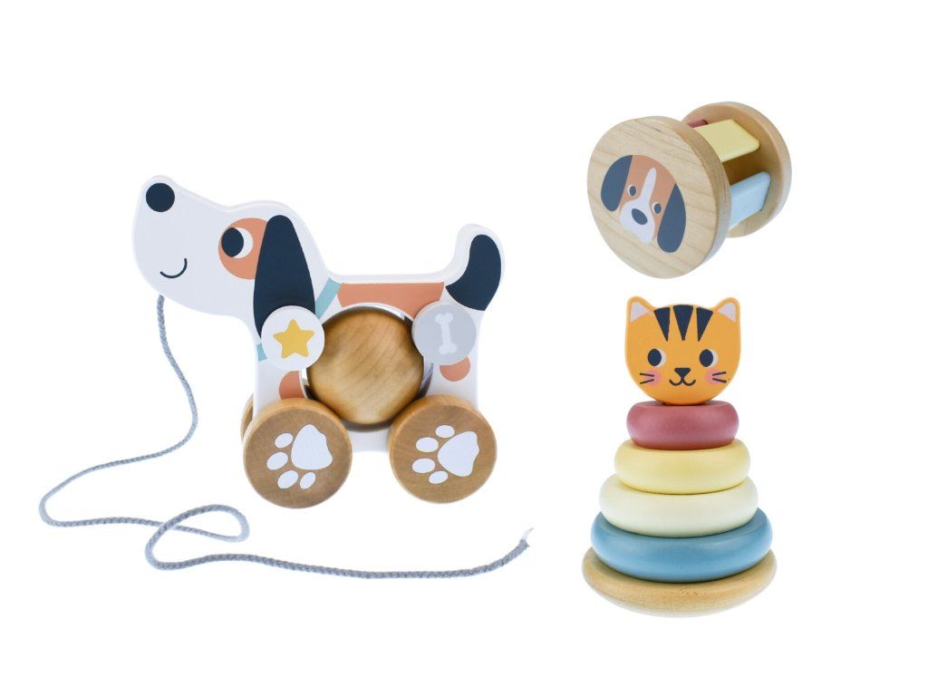 Set uključuje 3 klasične drvene igračke prikladne za djecu od otprilike 12 mjeseci. Zahvaljujući upotrebi visokokvalitetnog drva s glatkom, sigurnom površinom, igračke su izdržljive i ugodne za dječje ruke.