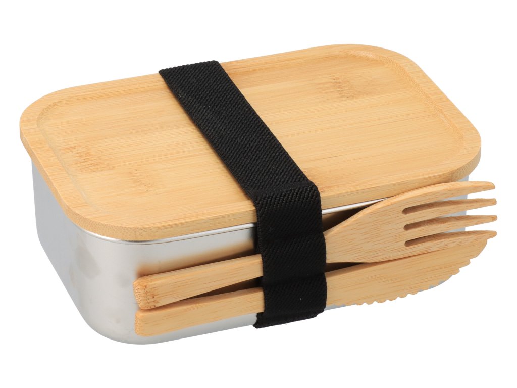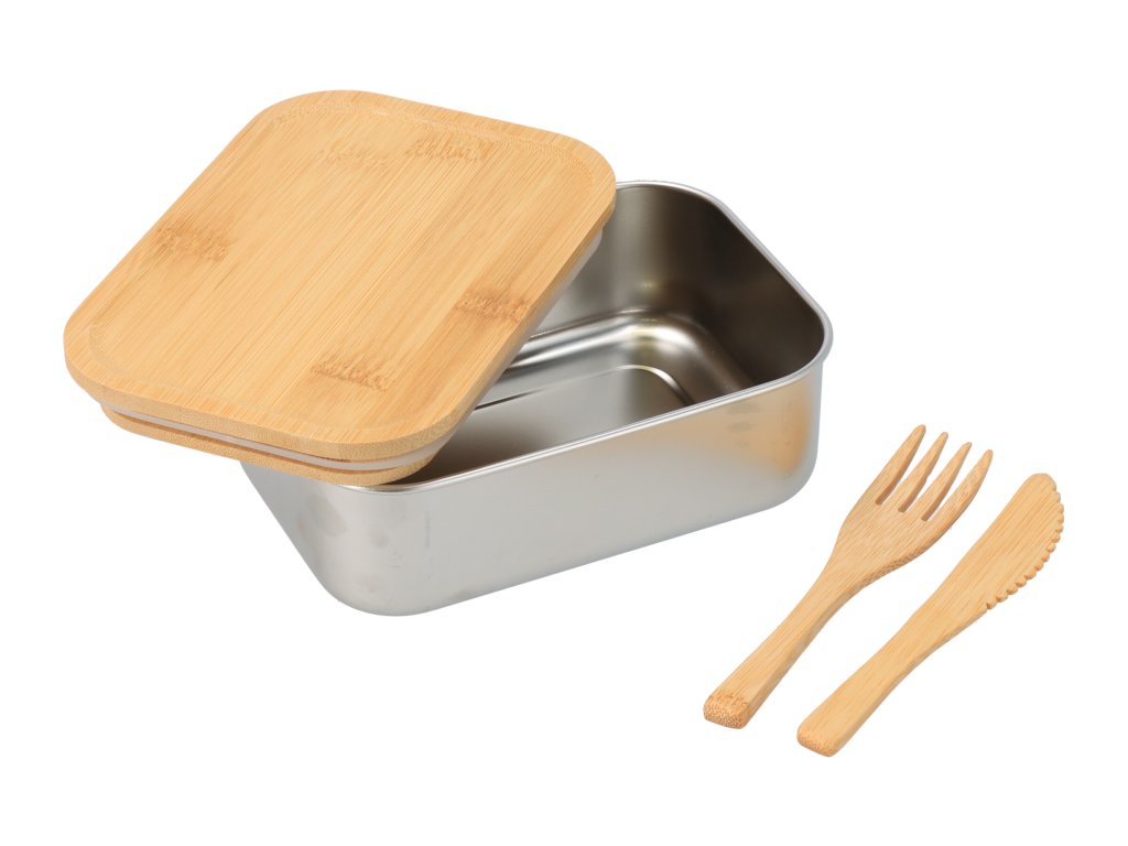 Posuda od nehrđajućeg čelika s poklopcem od bambusa i priborom za jelo