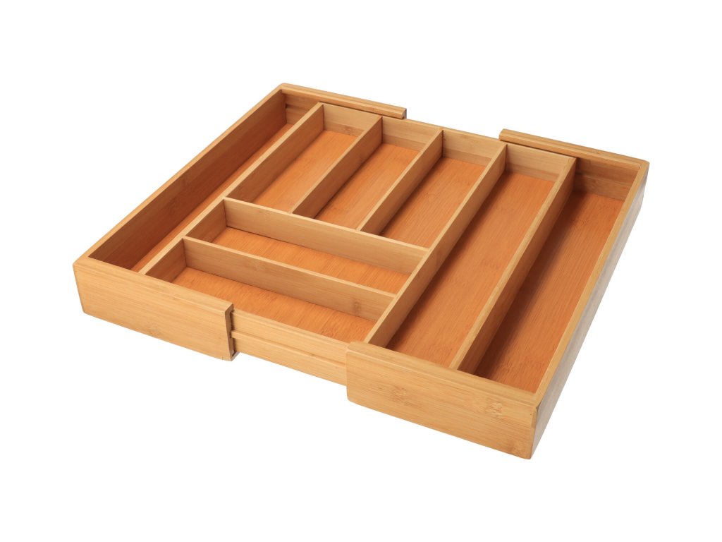 Organizator za pribor za jelo od bambusa koji će osigurati savršen red u kuhinji. Zahvaljujući dvama proširivim pretincima, možete jednostavno prilagoditi dimenzije ladici. Duljina se može podešavati od 35 do 58 cm.