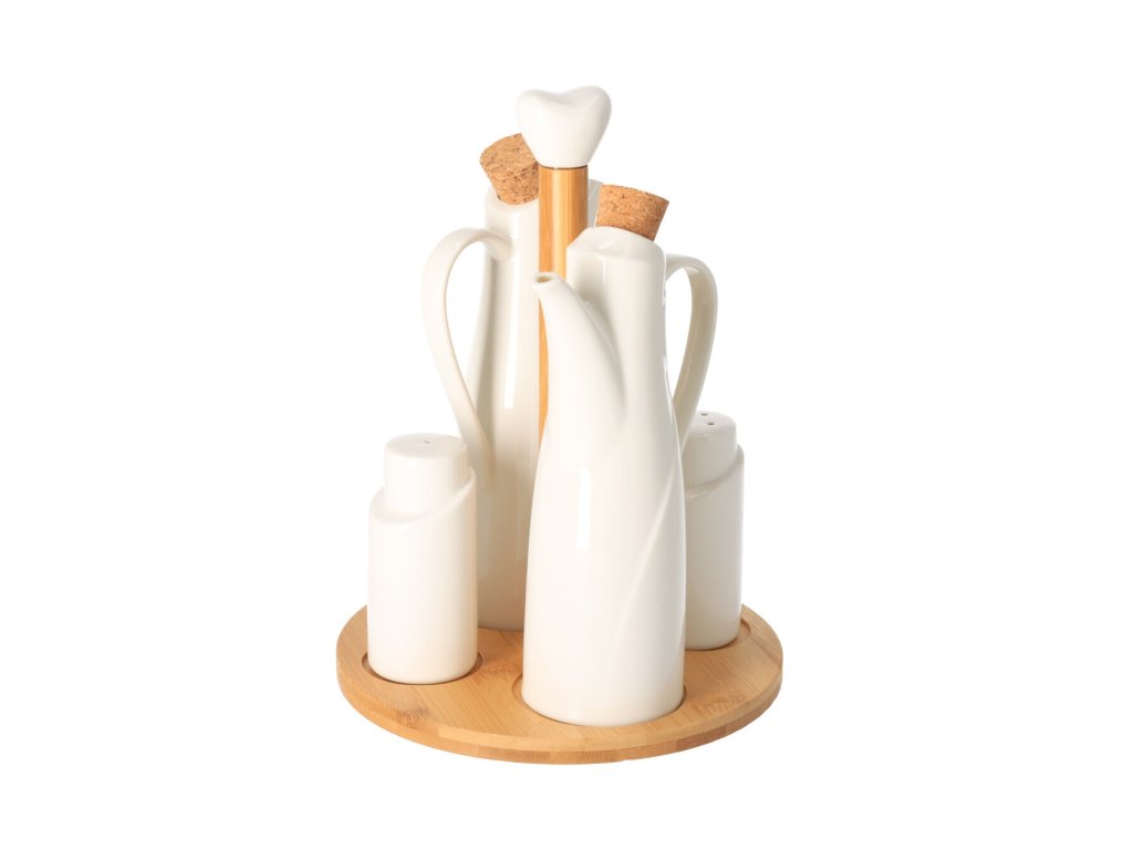 Kanta za ulje i ocat ima zapreminu 0,3 l, promjer 6 cm i visinu 19 cm. Posuda za sol i papar ima promjer 4 cm i visinu 9 cm. Tanjurić je promjera 17,5 cm, a zajedno s drškom visok je 22 cm.