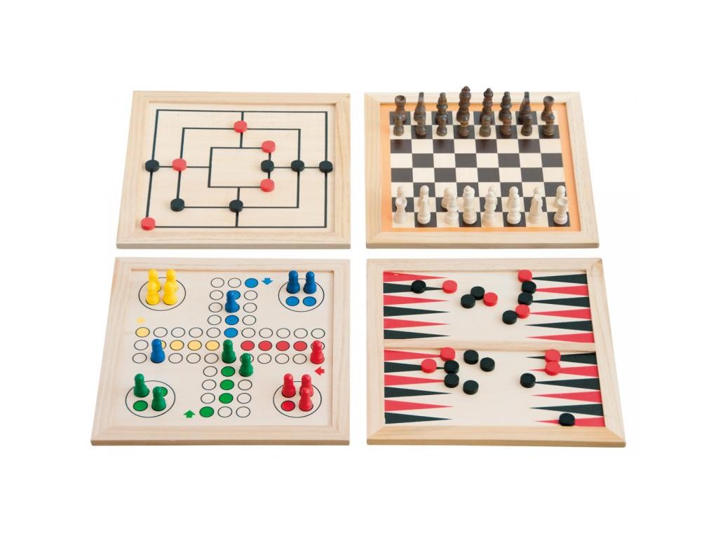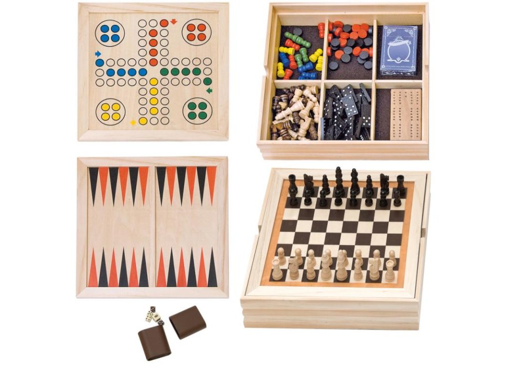 Nekoliko društvenih igara u jednoj kutiji - šah, dama, čovječe ne ljuti se, backgammon, begamon, mlin, domine i karte.