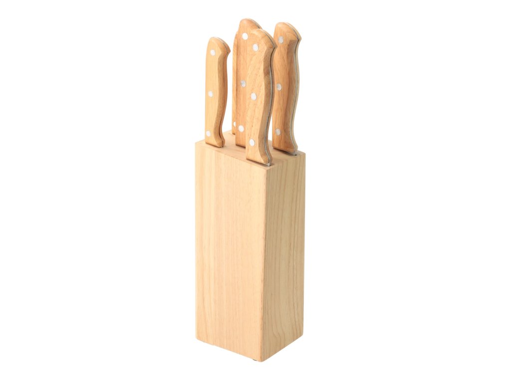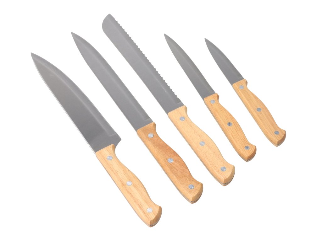 Set uključuje kuharski nož, nož za guljenje, nož za kruh, nož za otkoštavanje, pomoćni nož i drveni blok za odlaganje noževa.