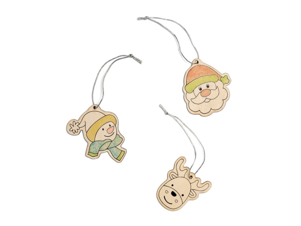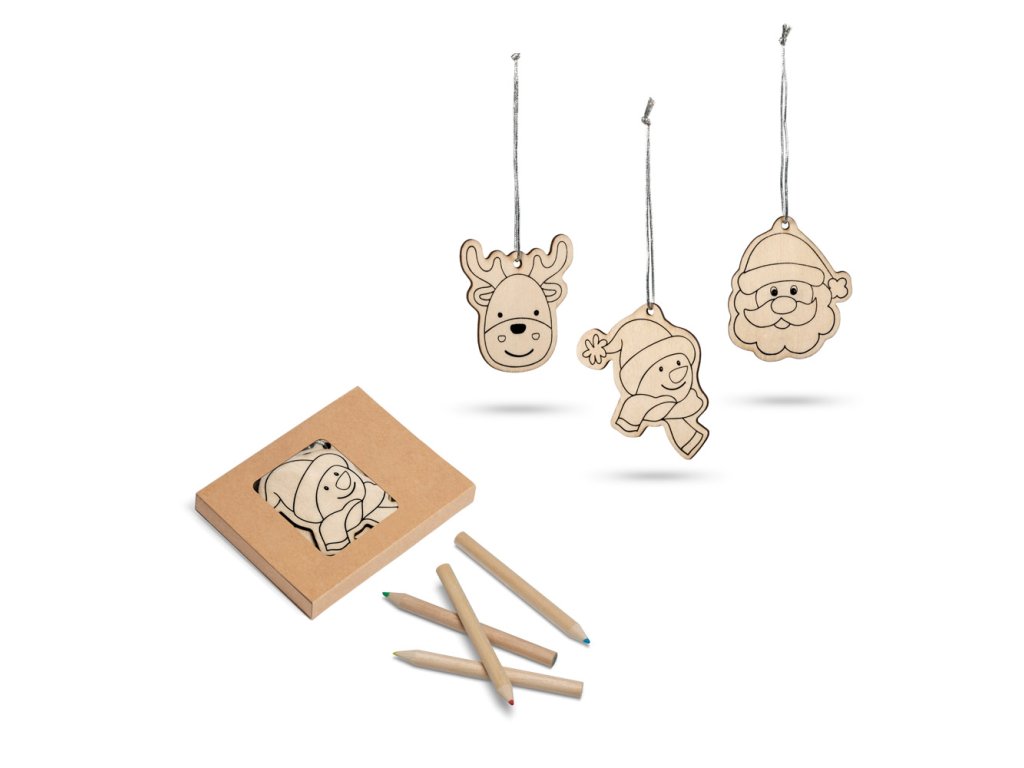 Set uključuje 4 olovke u boji i 3 drvena ukrasa.