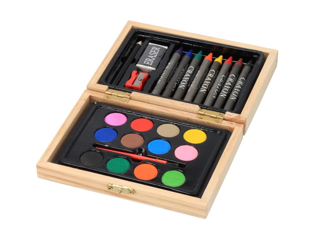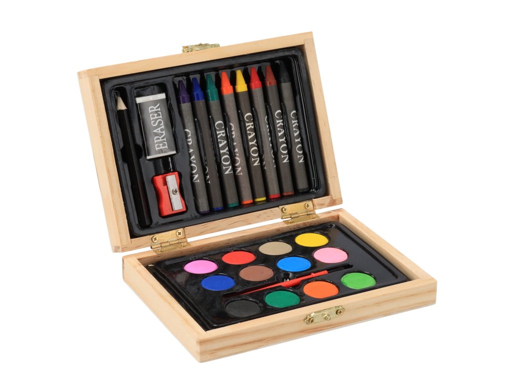 8 bojica, 12 vodenih boja, kist, olovka, šiljilo i gumica, sve u ovoj drvenoj kutiji.