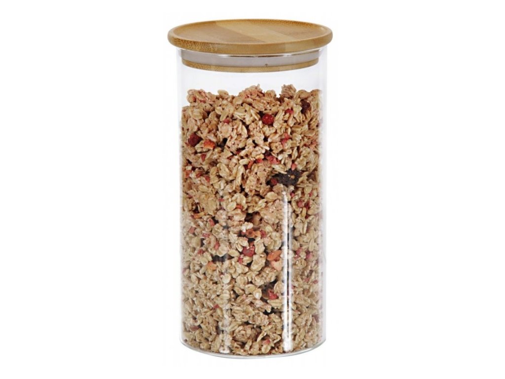Praktična staklenka zapremnine 1200 ml izrađena od visokokvalitetnog borosilikatnog stakla i poklopcem od bambusovog drveta za čuvanje namirnica poput raznih slatkiša, suhog voća, kave ili čaja. Pomoći će u održavanju reda u ormarićima ili na kuhinjskom pultu, a pohranjena hrana dugo će ostati svježa.