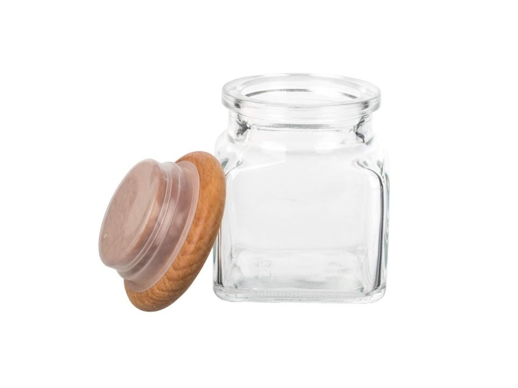 Staklena posuda za začine ima poklopac od bukovog drva koji je opremljen zatvaračem koji precizno pristaje.