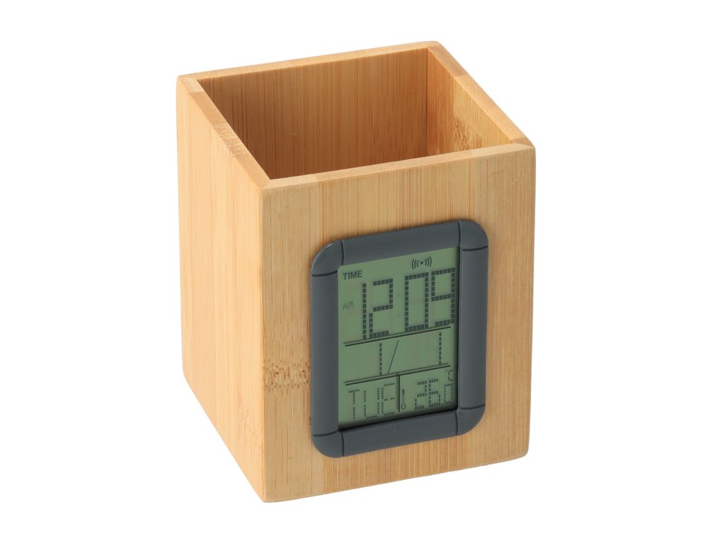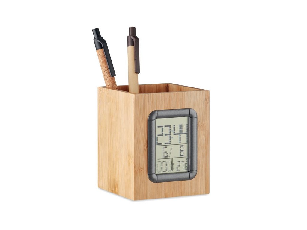 Tražite praktičan uredski pribor? Imamo stalak za pisaći pribor od bambusa opremljen digitalnom budilicom, kalendarom i termometrom. Pomoći će u održavanju reda na radnom stolu na poslu ili u dječjoj sobi.