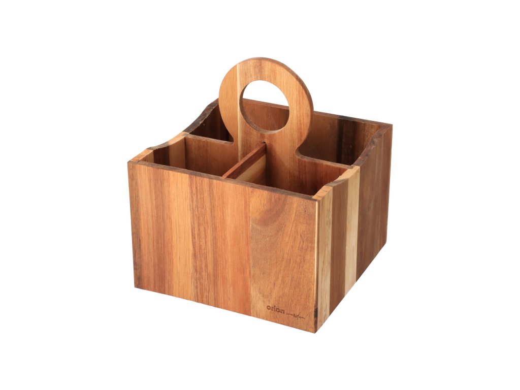 Stalak od bagremovog drva odličan je za odlaganje pribora za jelo, ali i začina, umaka ili salveta. Ima tri pretinca i lako se prenosi zahvaljujući drvenoj ručki.