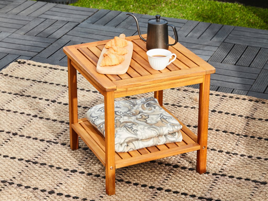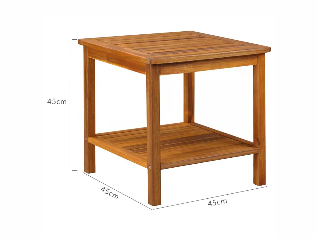 Elegantni bočni stolić izrađen je od prethodno nauljenog i vremenski otpornog bagremovog drva. Stol ima praktičnu donju policu koja nudi dodatni prostor za pohranu knjiga, ukrasa ili sitnih predmeta. Zahvaljujući univerzalnom dizajnu, prikladan je za vrt, terasu, balkon i unutarnji prostor.