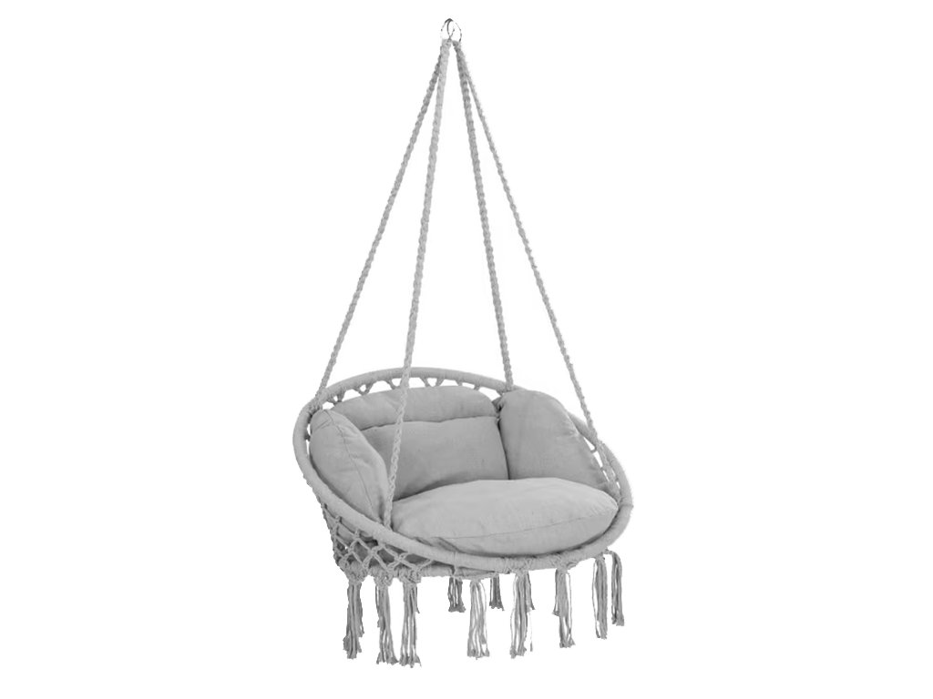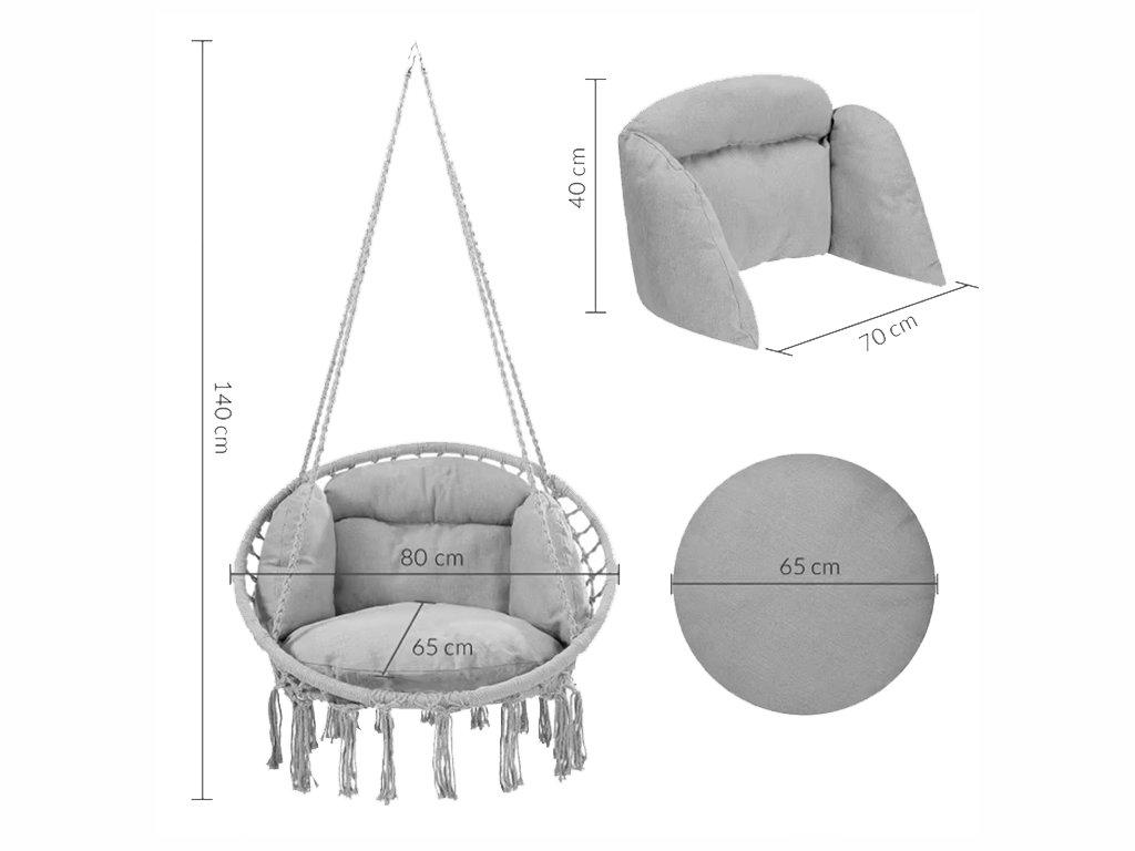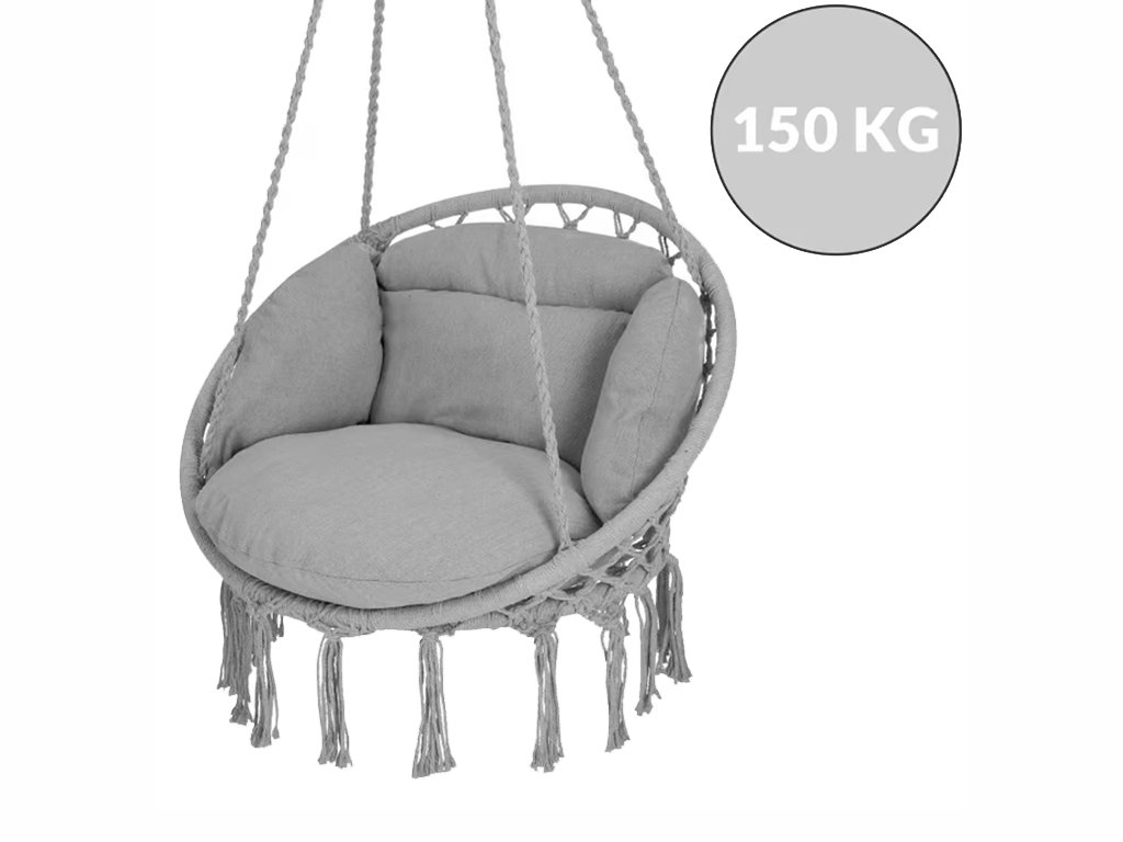S elegantnom sivom bojom, raskošnim makrame tkanjem i bezvremenskim boho dizajnom, ova stolica idealna je za unutarnju i vanjsku upotrebu te će savršeno nadopuniti postojeći vrtni namještaj.